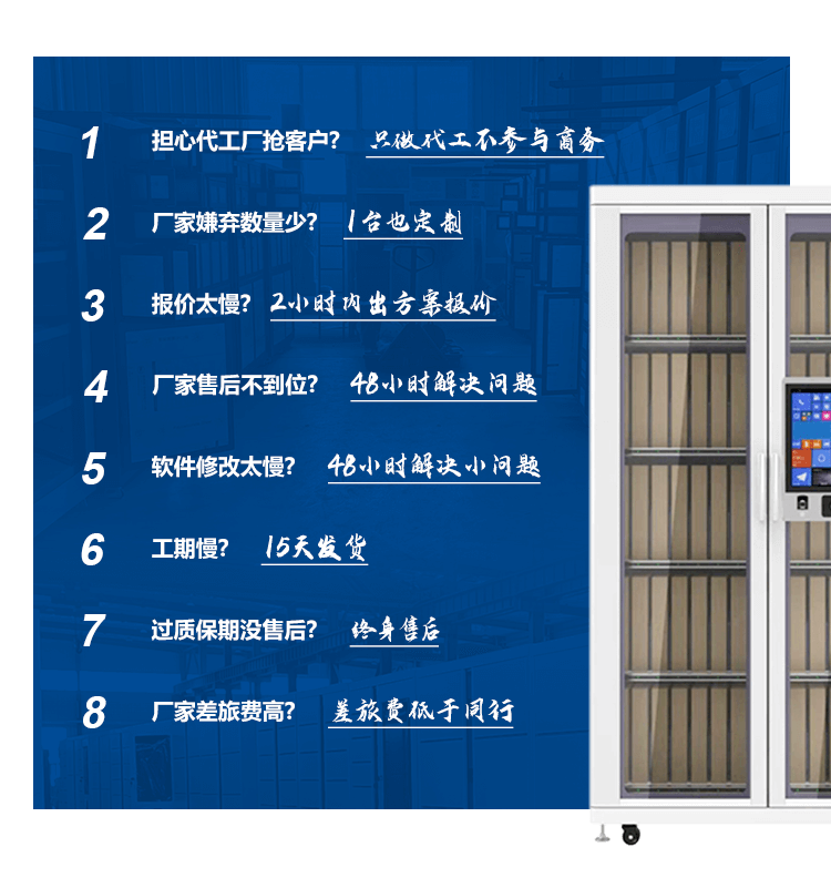 有15年管家式服務中間商的成熟經驗。成熟產品有RFID智能柜、稱重柜、光敏柜、智能工具車、公檢法檔案管理柜。支撐軟件定制開發。